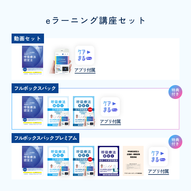 【フルボックスパックプレミアム】【フルボックス】ご購入のお客様のみ、特典として特別問題100問をプレゼントします。(特別問題は10月頃アプリにのみ配信予定です。) 呼吸療法認定士試験では、最新の公式テキストに新たに追加された箇所や変更された箇所が出題されやすい傾向にあります。 そこで特別問題では、例年夏頃に発送される講習会テキストにて改訂された箇所を迅速に調査・分析し、厳選した問題を配信いたします。 受験前の総仕上げ問題としてご活用ください。