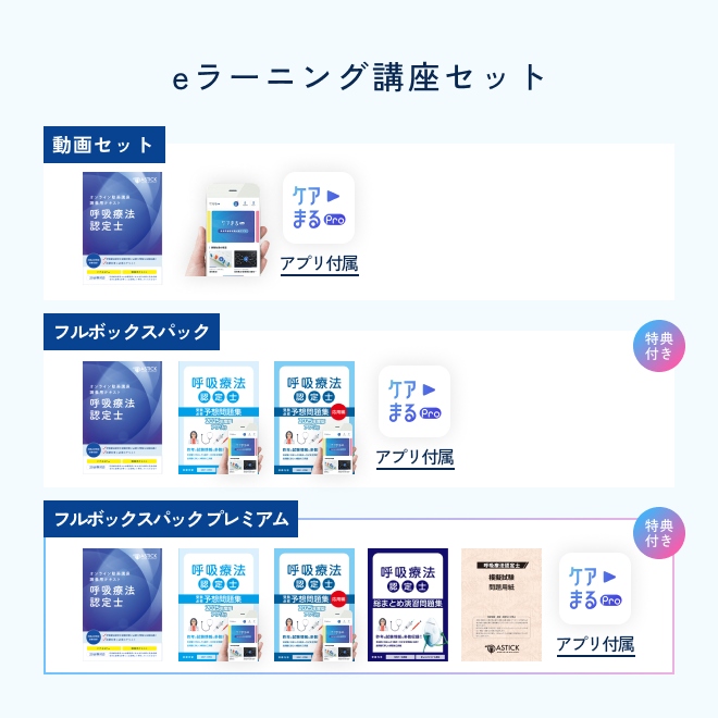 【フルボックスパックプレミアム】【フルボックス】ご購入のお客様のみ、特典として特別問題100問をプレゼントします。(特別問題は10月頃アプリにのみ配信予定です。) 呼吸療法認定士試験では、最新の公式テキストに新たに追加された箇所や変更された箇所が出題されやすい傾向にあります。 そこで特別問題では、例年夏頃に発送される講習会テキストにて改訂された箇所を迅速に調査・分析し、厳選した問題を配信いたします。 受験前の総仕上げ問題としてご活用ください。