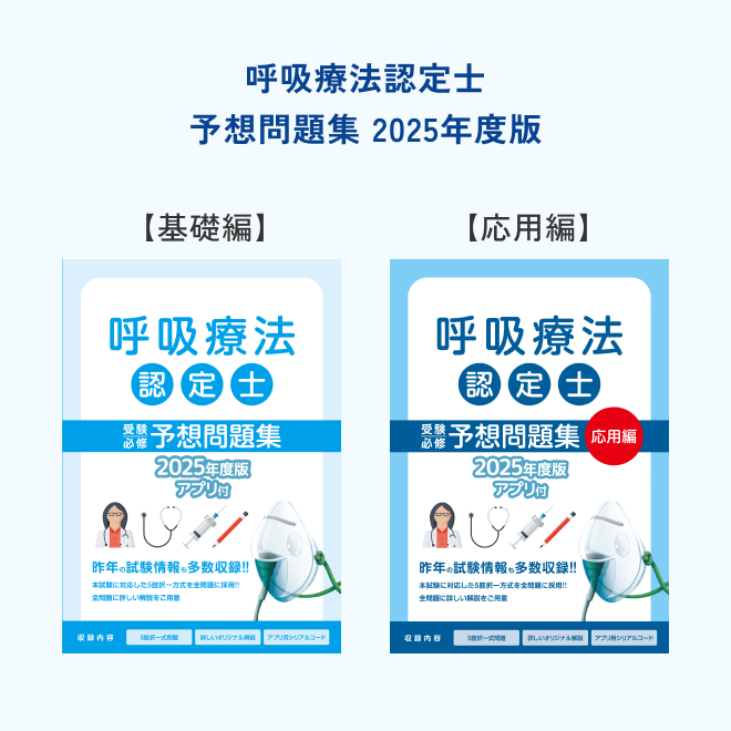 呼吸療法認定士全国統一模擬試験に受験必勝問題集(基礎編・応用編2冊)がセットになった商品です。